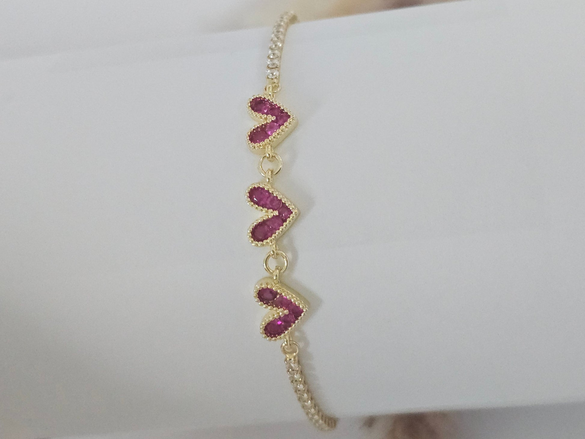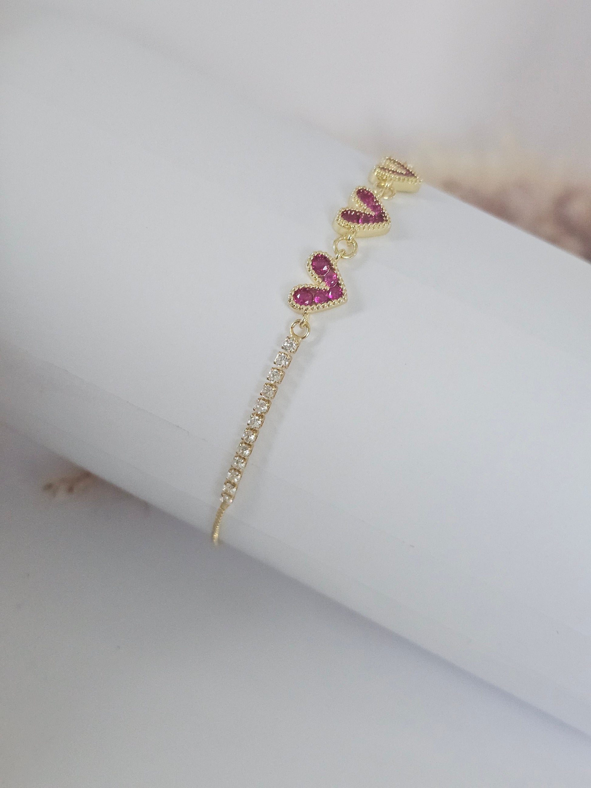 Three Heart bracelet. This stunning accessory features three hearts in a vibrant pink, adding a touch of playfulness to any outfit.